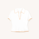 款式介绍 PRODUCT DETAIL + 女装Polo V领衣服,交叉原身交叉流苏饰边。 Women's Polo V-neck short-sleeved top with knitted double coloured fringe trims. 毛料 YARN + 2 条 32S/2 麻爽高捻棉 2 Ply 32S/2 Linen-feel High-twist Cotton 针种 GAUGE: 14G 编织时间 KNITTING TIME: 77 分钟 MINS (速度 SPEED 70) 模特身高:身高 166 CM / 胸围 80 CM / 腰围 66 CM / 臀围 85 CM Model Measurements: Height 166 CM / Chest 80 CM / Waist 66 CM / Hips 85 CM